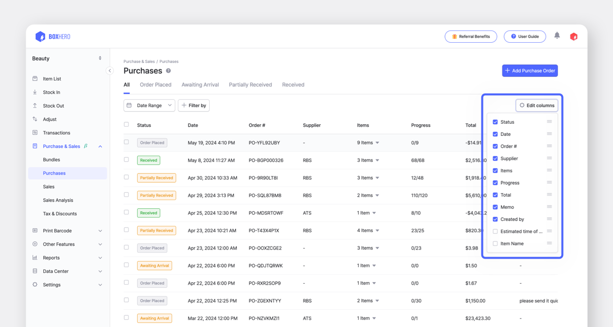 The BoxHero Team has made improvements to the Purchases & Sales menu so that you can now select which details are to be shown on your screen.